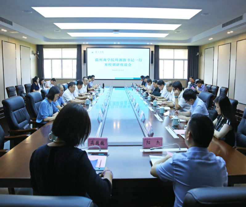 2023年7月12日,温州商学院党委书记、执行校长周湘浙率团来我校考察交流。校党委副书记、校长李俊杰,副校长汪亚明,校党委委员、宣传部(教师工作部)部长廖峰、教育基金会理事长等接待了温州商学院考察团一行。